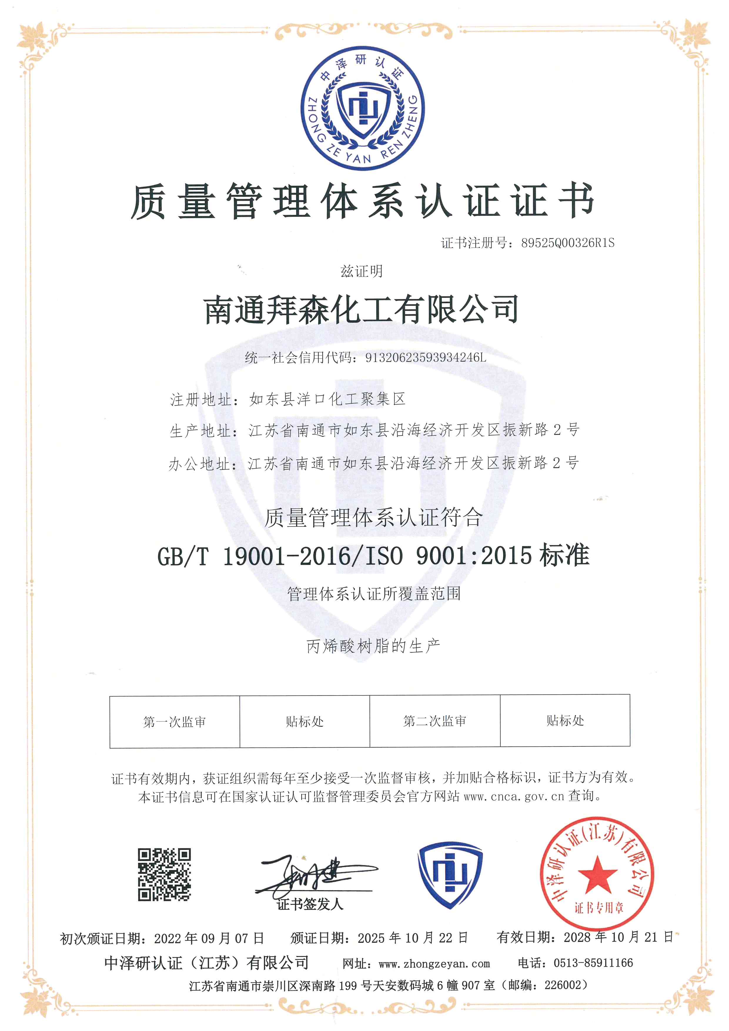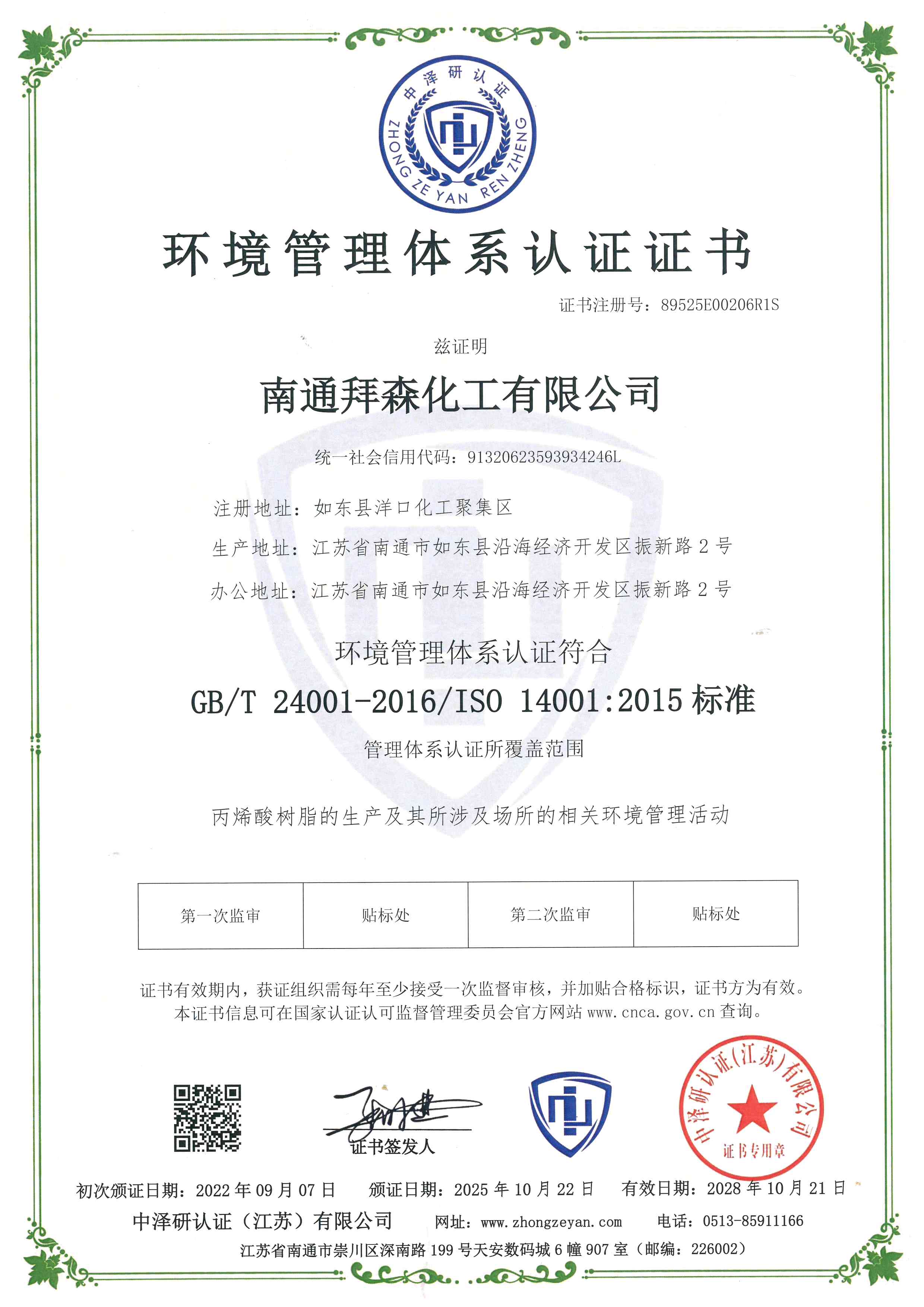 南通拜森化工有限公司是由南通三瑞斯化工有限公司搬迁扩产至化工园区后的新公司。南通三瑞斯化工有限公司于2003年4月成立,公司一直致力于涂料用丙烯酸树脂的研发、生产和销售工作,2012年,为响应政府“集约化治污、集聚式发展”的号召,从如东曹阜镇搬迁到如东沿海经济开发区。同时,公司也调整了企业发展方向及产品结构,引进了一批产品研发人员,对水性丙烯酸树脂、无苯丙烯酸树脂和特种树脂的研发工作,新公司更名为南通拜森化工有限公司。